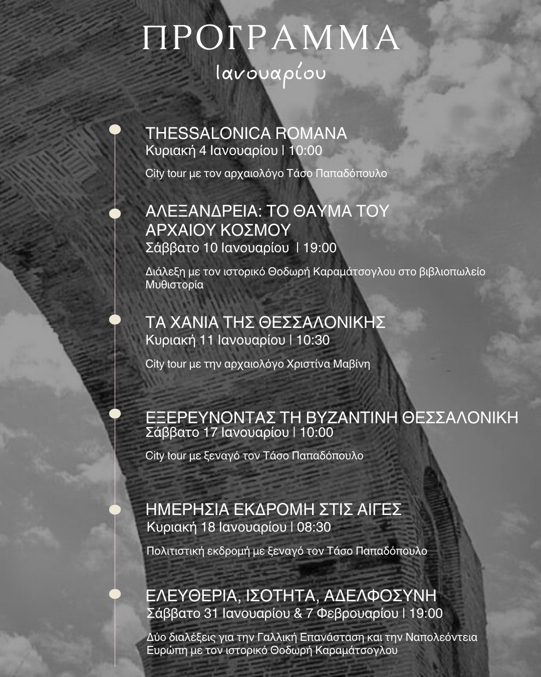 Ένα πολυθεματικό πρόγραμμα περιηγήσεων, διαλέξεων και εκδρομών ανοίγει το νέο έτος και σας προσκαλούμε σε ένα ταξίδι στον χρόνο και τον χώρο: Από τη ρωμαϊκή και