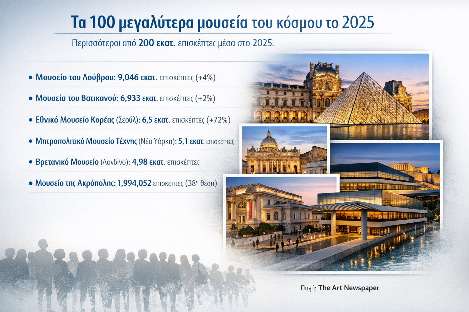 Τα 100 πιο δημοφιλή μουσεία του κόσμου υποδέχτηκαν πάνω από 200 εκατ. επισκέπτες το 2025, έναντι περίπου 230 εκατ. το 2019, προ πανδημίας. Τα στοιχεία προέρχονται από την ετήσια λίστα της βρετανικής The Art Newspaper. Μουσείο του Λούβρου, Παρίσι Επισκέπτες: 9,046 εκατ. Αύξηση 4% σε σχέση με το 2024 6% κάτω από τα προ COVID επίπεδα Μουσεία του Βατικανού Επισκέπτες: 6,933