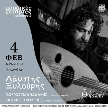 Ο Λάμπης Ξυλούρης στις 4 Φεβρουαρίου στις 8:30 μ.μ. στον ζεστό χώρο του Μουσείου Θύραθεν. Θα μας ταξιδέψουν σε ένα μουσικό ταξίδι μέσα από αυθεντικές, παραδοσιακές